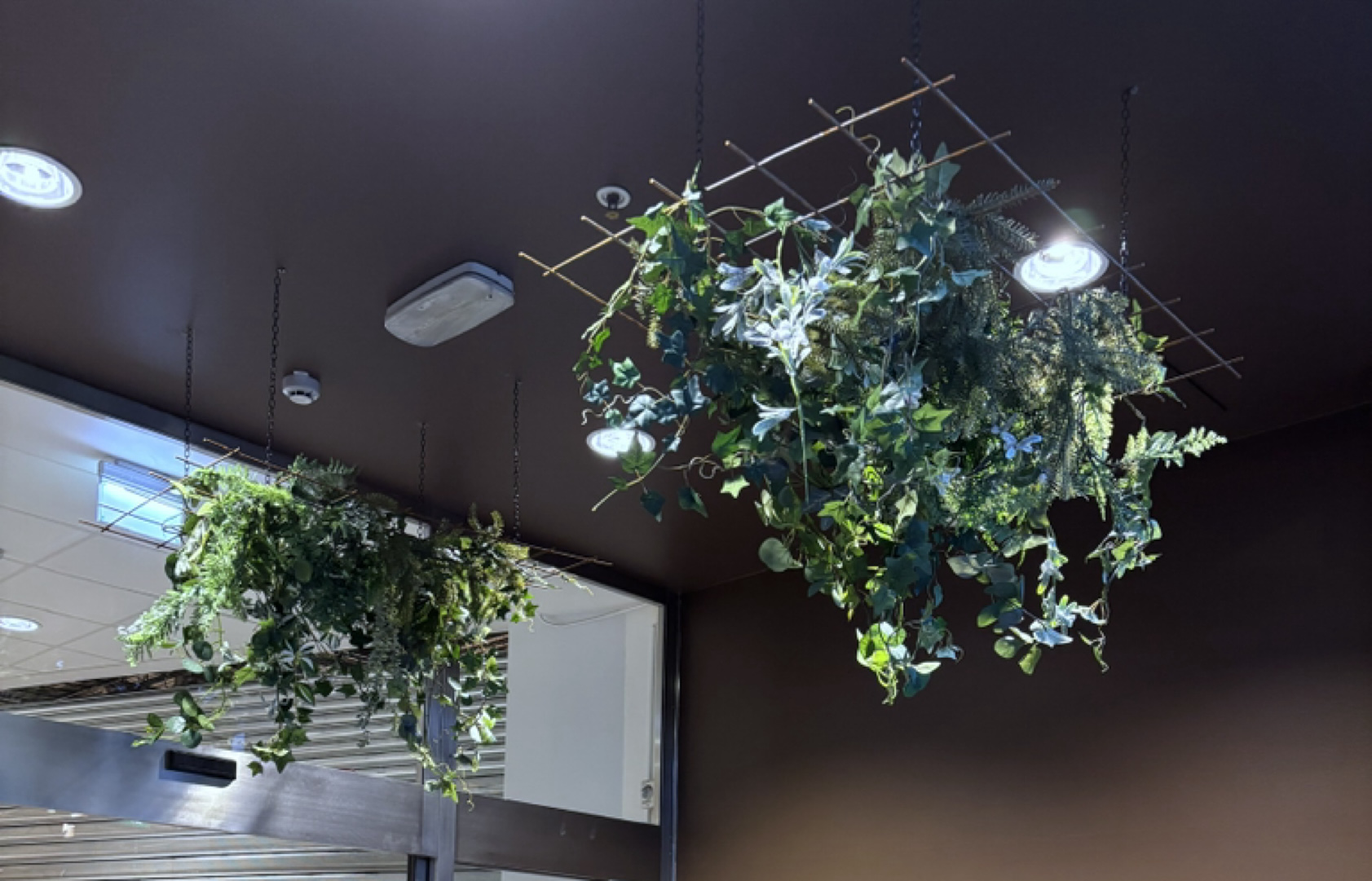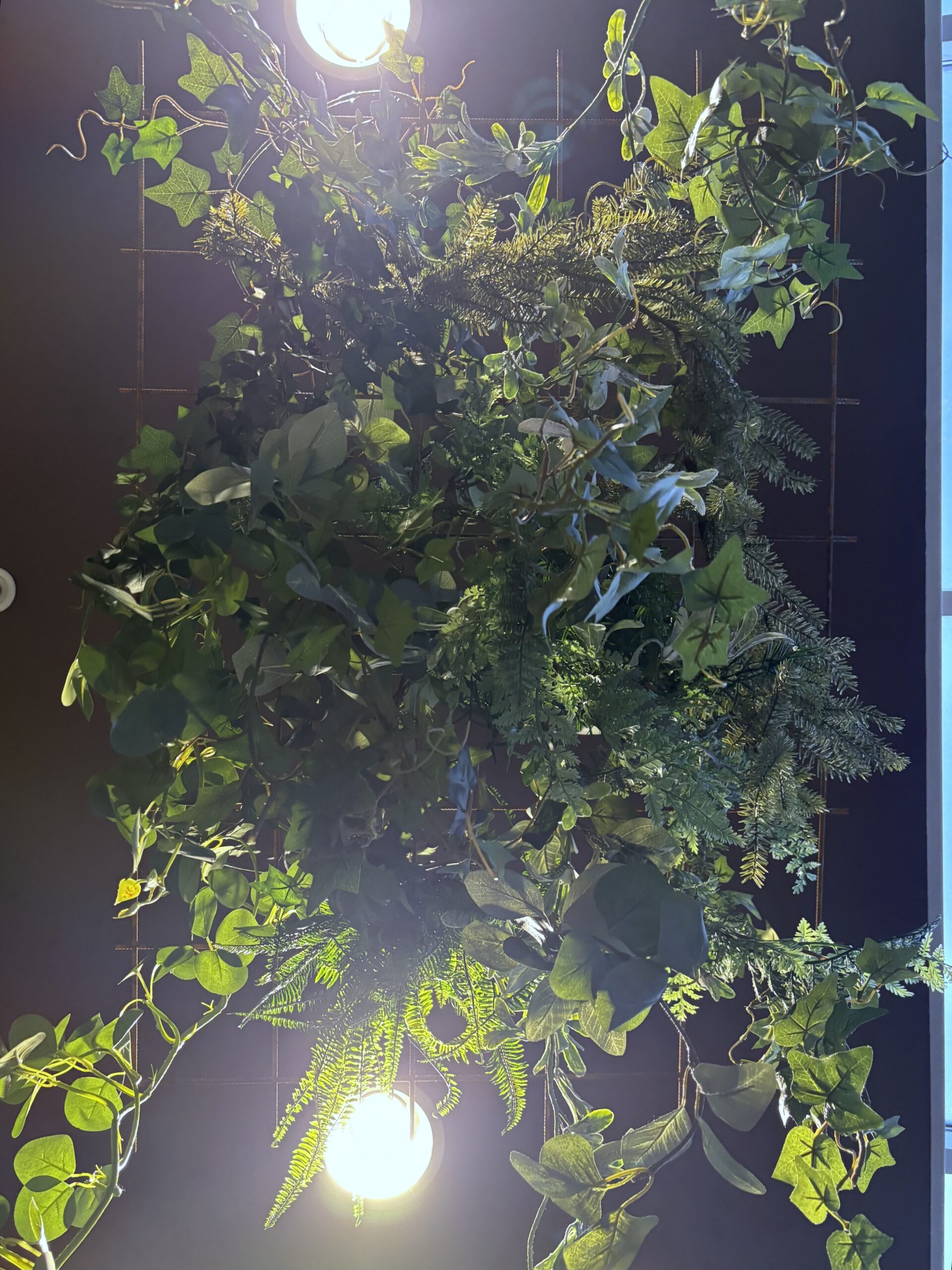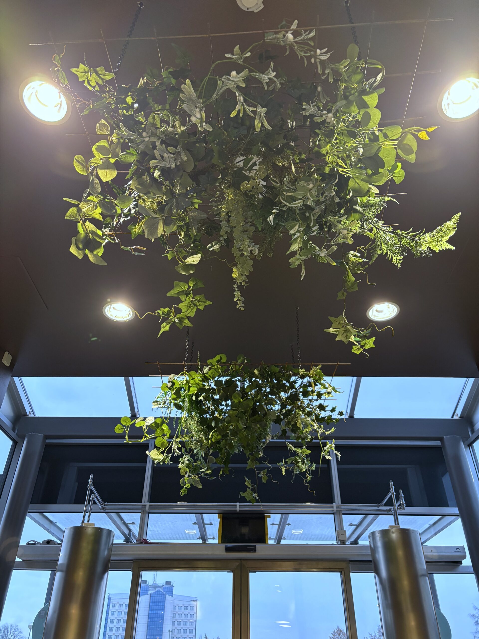Köpa in armeringsnät, kedjor och såklart konstväxter. Flamskydda dessa och såklart sedan en smart och hållbar montering eller exponering av växterna i nättaken.