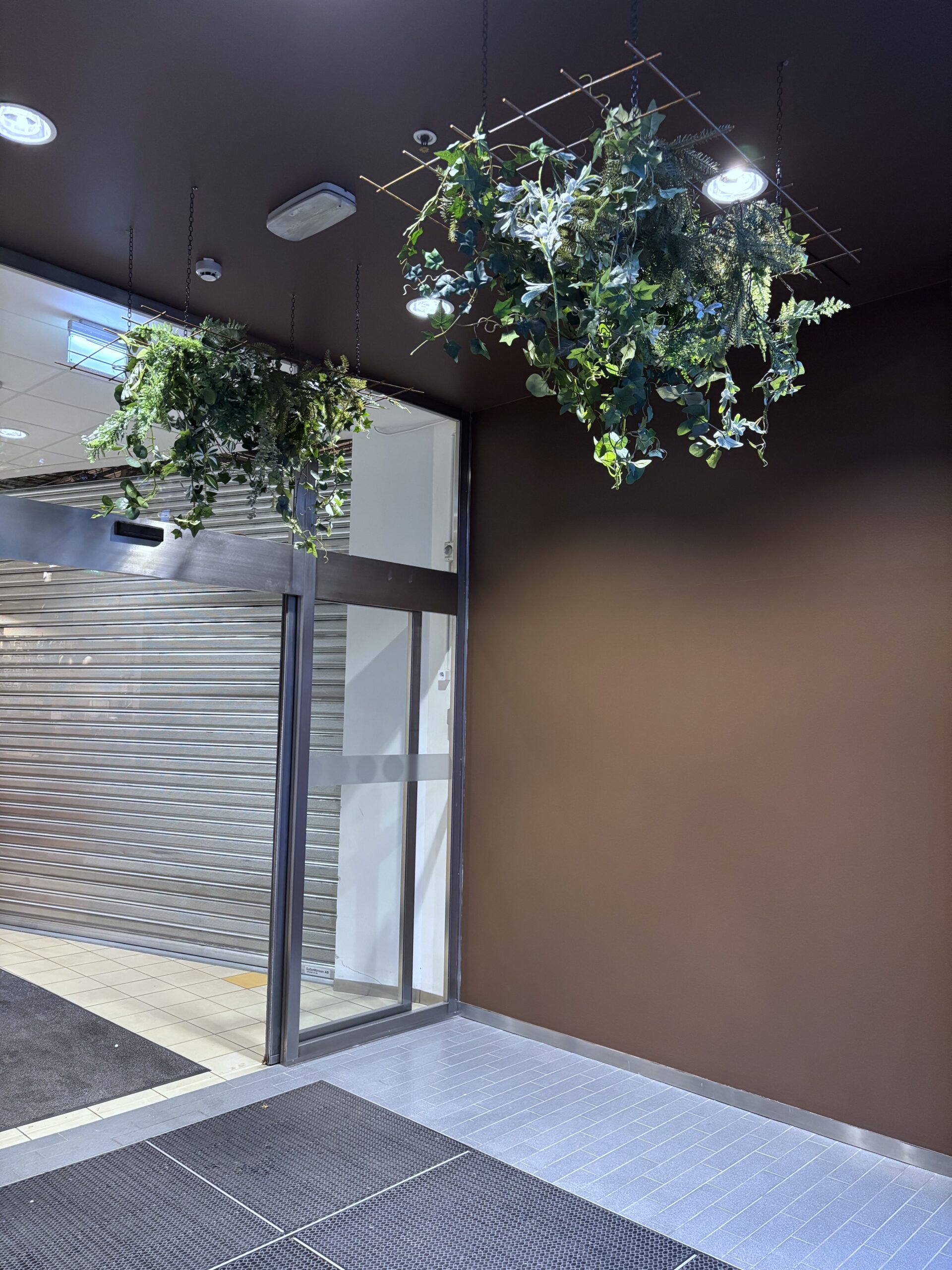 Jag fick frågan om att lösa växt tak till dessa 4 entréer. Ett roligt men samtidigt utmanande uppdrag. Här behövde jag hitta smarta och genomförbara lösningar, även att ha en kontakt med företaget som gjort alla justeringar i entréerna för att få tidsplan, upplägg och även guide och hjälp med montering av näten – sen är det till att hitta produkter som passar för ändamålet.